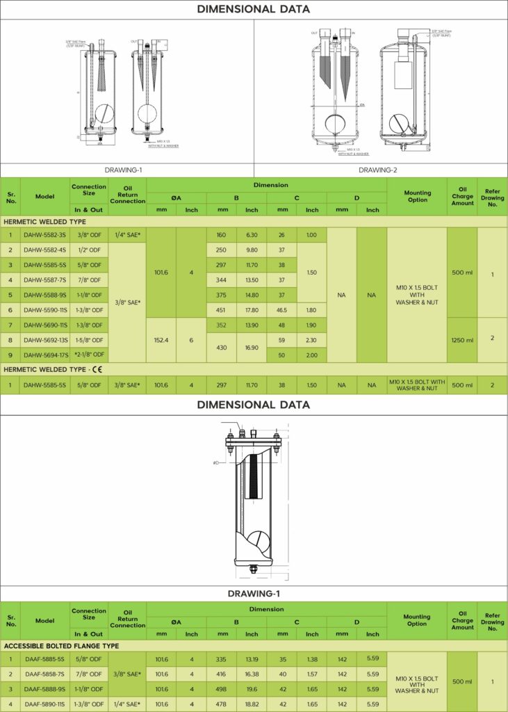 Dry All off-the-shelf Oil Separator models are available from 7.3 kw to 56.3 kw for R-410A @4ºC Evaporation temperature. For other refrigerants and different evaporative condition, please refer to our catalog.